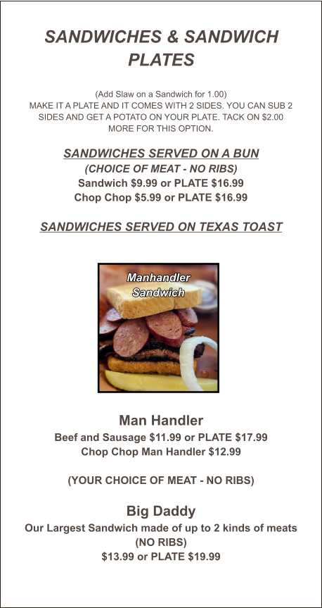 Our Largest Sandwich made of up to 2 kinds of meats (NO RIBS)