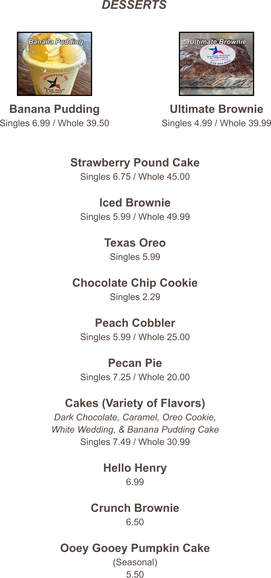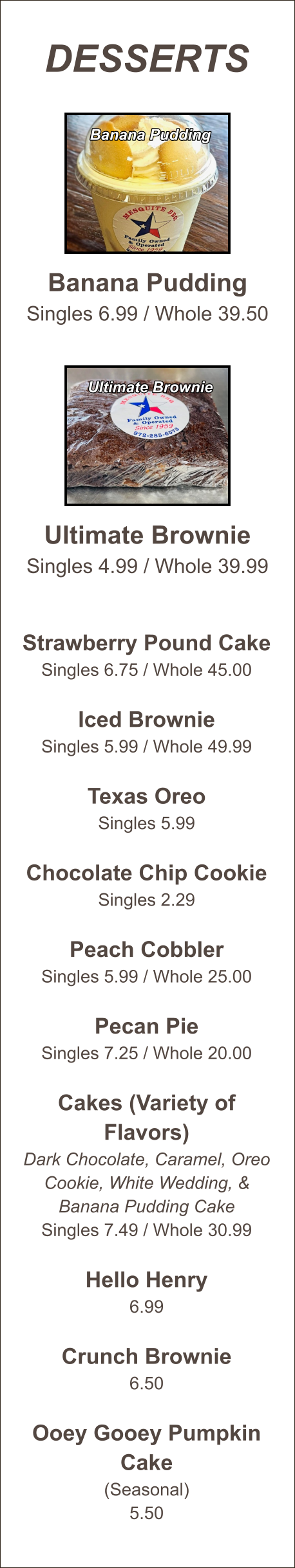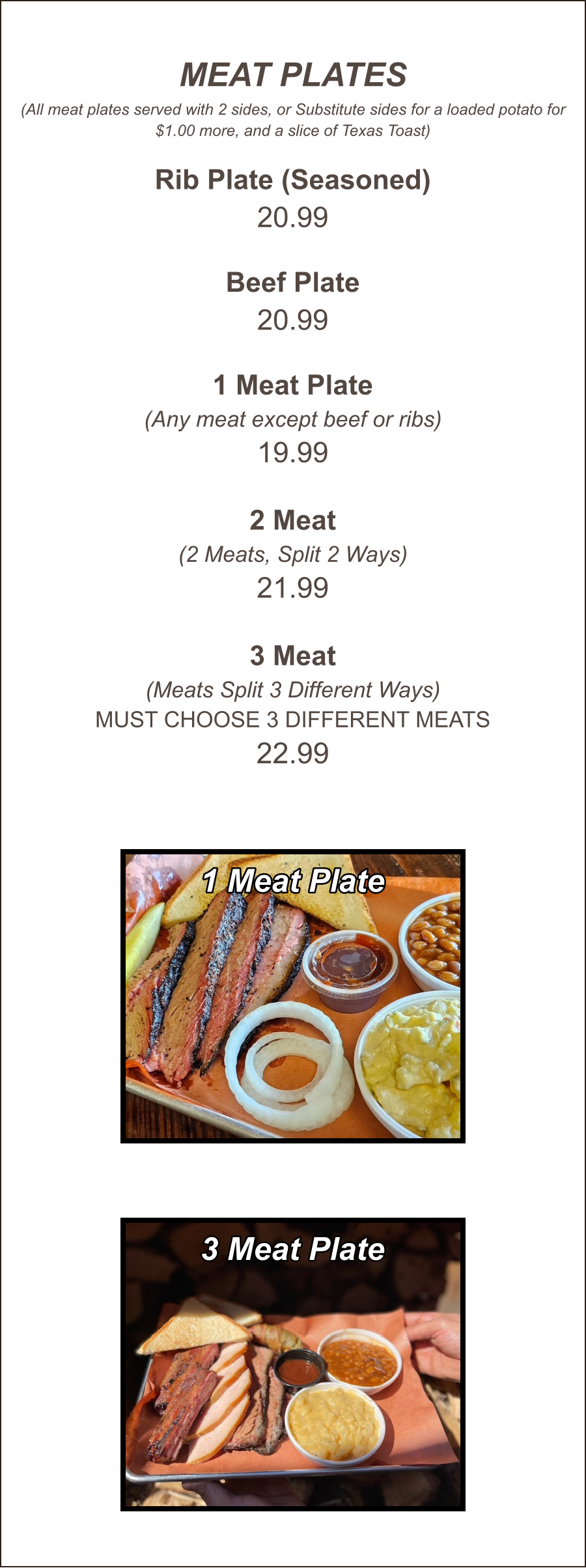 (All meat plates served with 2 sides, or Substitute sides for a loaded potato for $1.00 more, and a slice of Texas Toast)